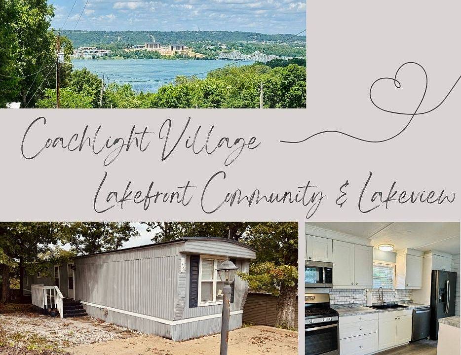 Welcome Home to Coachlight Village - Lakeview Living in Style This beautifully remodeled 3-bedroom, 2-bathroom home is located in the peaceful Coachlight Village Mobile Home Park in Kimberling City, Missouri - a friendly, 55+ lakefront community. Originally built in 1983, the home has been completely updated with modern finishes designed with comfort and style in mind. Throughout the interior, you'll find beautiful new vinyl flooring and upgraded windows that fill the space with natural light. The kitchen has been fully remodeled with a gas stove, new refrigerator, fresh cabinetry, and a custom coffee bar and buffet area - perfect for starting your morning or entertaining guests. Step through the front door and you're welcomed by a warm fireplace and an inviting living room that offers a clear view of the lake, giving you the relaxing feel of lakeside living right from your sofa. The thoughtful split floorplan places the main bedroom on one side of the home, with the two additional bedrooms on the other, offering both privacy and a natural flow from room to room. One of the standout features of this home is the brand-new oversized rear deck, which offers a year-round view of the water. Whether you're enjoying a quiet morning coffee or hosting friends, it's the perfect place to unwind and take in the beauty of your surroundings. The community offers an unbeatable location right on the lake, with a monthly lot rent of $504 that includes water, sewer, trash, lawn maintenance, street maintenance, access to a swimming pool, and the use of the community center. This is a 55+ community, and a cash purchase is preferred. Community rules do apply. If you're looking for a move-in-ready home with a water view in a quiet, well-maintained neighborhood, this is your perfect match.