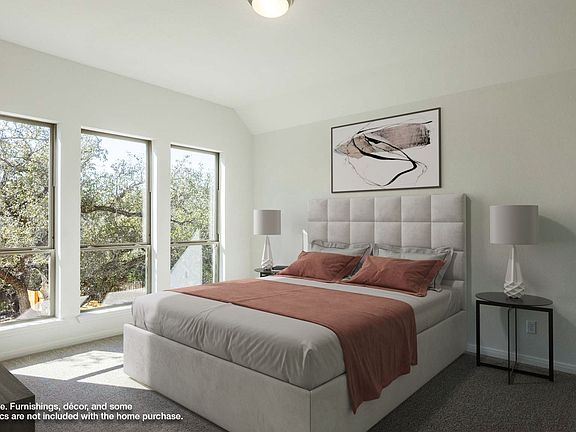 Entry leads to open family room with wall of windows. Kitchen features corner walk-in pantry, 5-burner gas cooktop and generous island with built-in seating space. Dining area set just across from kitchen. Primary suite includes bedroom with wall of windows. Double doors lead to primary bath with dual vanities, corner garden tub, separate glass-enclosed shower and walk-in closet. Home office with French doors set at back entrance. Secondary bedrooms feature walk-in closets. Extended covered backyard patio. Two-car garage. Representative Images. Features and specifications may vary by community.
