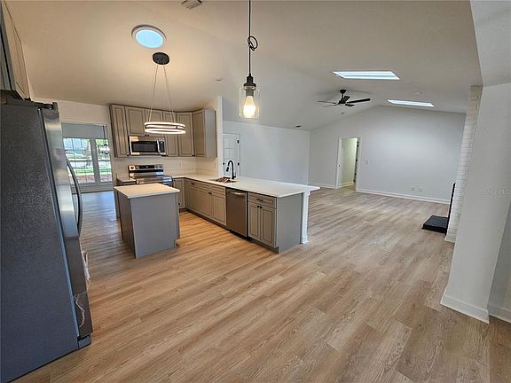 Discover effortless Florida living in this stunning, updated home nestled in the highly desirable Spring Valley private community with optional membership to enjoy lake access for boating and fishing, park and playground, tennis, basketball and volleyball courts, and a practice green. Step inside this beautifully renovated residence and be greeted by an inviting open floor plan bathed in abundant natural light. Skylights and expansive French patio doors from the living room and master bedroom flood every space with sunshine, creating a bright, airy atmosphere that seamlessly blends indoor comfort with outdoor bliss. The thoughtful layout begins with a spacious office on the left perfect for remote work or a quiet retreat and a generous formal dining room on the right that flows effortlessly into the heart of the home: a contemporary open kitchen featuring solid wood cabinets, brand-new appliances, and an oversized island with ample seating for casual meals or entertaining friends. At the center, the expansive living room serves as the home's welcoming hub, anchored by a charming brick fireplace flanked by elegant glass French doors that open to the relaxing backyard. Every inch has been thoughtfully utilized, making the home feel surprisingly spacious and efficient. Retreat to the private master suite tucked in the back right corner, where French doors lead directly to your own private oasis: a large screened-in pool and an expansive covered lanai ideal for year-round relaxation, morning coffee, or evening gatherings under the stars. On the opposite side, three additional well-proportioned bedrooms share a full bathroom conveniently accessible from both indoors and the pool area perfect for family, guests, or a growing household. Outside, the property sits proudly on a generous half-acre lot, offering a sprawling backyard for play, gardening, or future expansions, plus a wide driveway with plenty of parking. Recent upgrades include fresh luxury vinyl plank (LVP) flooring throughout, ensuring durability, easy maintenance, and timeless style. This move-in-ready gem combines contemporary updates with classic Florida charm in one of the area's most sought-after communities.