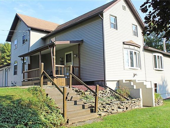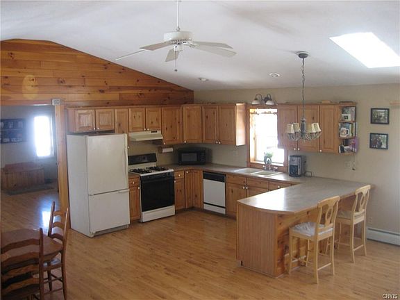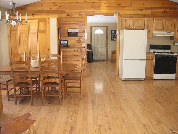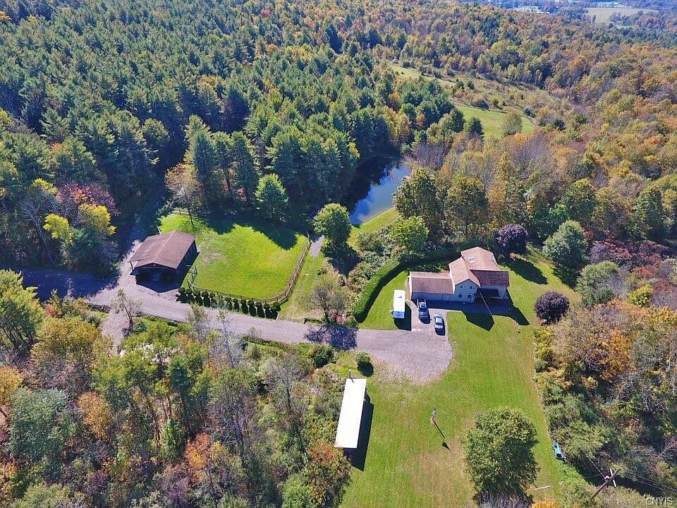 103.67 private acres at the end of a dead-end town maintained road. Beautiful light-filled home with cathedral ceilings, 3 bds, 2 bas, 2+-car garage, horse facilities, 12 x 32 ft pole barn, fields, timberland, 3 miles of mowed trails, hunting blinds, food plots, 3 ponds, pavilion, dock, garden, planted conifers, fruit trees, and scenic views. The property is meticulously maintained by owner conservationist. No close neighbors. Walkout semi-finished basement, outdoor wood-burning stove heats the entire house with baseboard hot water heat, 4 heat zones, oil backup, 200 amp service wired for generator. Horse barn is 30 x 44 ft. with concrete floor, electric, frost free well, attached roof area for tractor/access. Solar powered vinyl horse fence for main pasture; a run leads to a second large pasture. Miles of trails for riding, hiking, ATVs. The land is mostly gently rolling, approx 75% wooded, multiple decorative varieties, hay fields (could be tillable, easily organic), pasture, thickets w/ food plots. Abundant wildlife sign throughout. 2 hunting blinds. 10x16 pavilion w/ electric. Security and signal boosting systems. Bluebirds. Rare private setting. Prequalified buyers.
