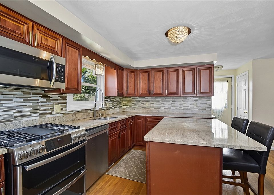 Open floor planStylish back splashLarge kitchen islandShaker cabinetsStone counter-tops