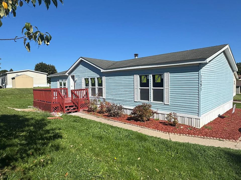 Modern 3-bed, 2-bath double-wide in Northern Estates (Belmont). Built 1991, ~1,450 SF with an open plan for easy living. Living room features a cozy fireplace. Kitchen offers stainless appliances, a large island, and abundant storage. Primary suite includes a walk-in closet and private bath with dual sinks; two additional bedrooms + full bath provide space for guests or a home office. Enjoy a private driveway, central A/C with Ecobee smart thermostat, and 8'x8′ storage shed. Community perks: pool, splash pad, playground, basketball courts, fitness center, clubhouse, rec room, and new outdoor pavilion. Minutes to I-96, parks, shopping, and dining.