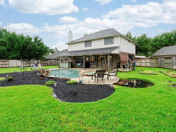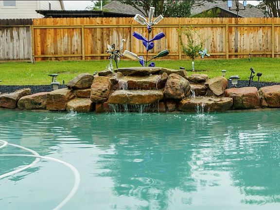Enjoy one of the largest backyards in the neighborhood with plenty of green space, mature trees, water features, and fully fenced privacy.