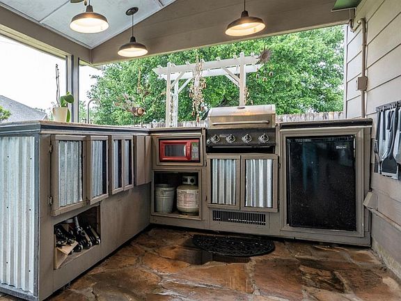 Expansive covered patio with full outdoor kitchen, built-in grill, refrigerator, and multiple seating areas