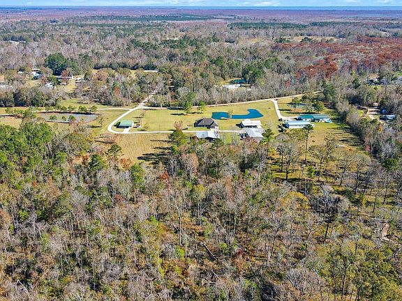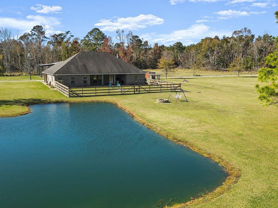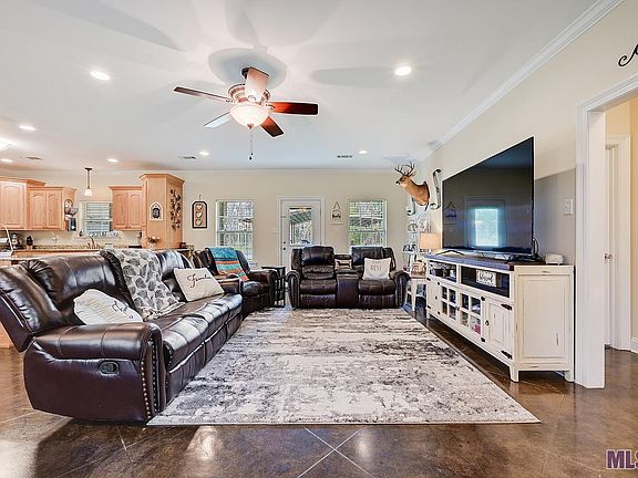 Well-maintained custom 3 bedroom, 2.5 bath home located on almost 5 acres! Qualifies for 100% Rural Development financing and in the top-rated Livingston parish school district. Split floorplan design. The kitchen has stained custom staggered cabinets, slab granite countertops, stainless steel appliances, commercial 6-burner gas range, built in microwave, large peninsula with breakfast bar, and separate walk in pantry. The kitchen and dining rooms are open to the living room, which has a gas log fireplace with granite surround and brick hearth. The spacious master bedroom features an additional sitting area that can be used as an office or workout space. The en suite bath includes a corner soaking tub, separate shower, dual vanities, make up vanity, separate water closet, and large walk in closet. NO CARPET! Stained concrete flooring throughout. Tankless water heater. The private backyard includes a large covered porch, fenced yard area, fire pit, and pond. Perfect for entertaining! The property also features a pole barn with over 4100 SF of storage space. Access to fishing at bayou across the road. Hunting on woods of property with walking / 4 wheeler trail to the deer stand and food plot. Flood zone X and did not flood.