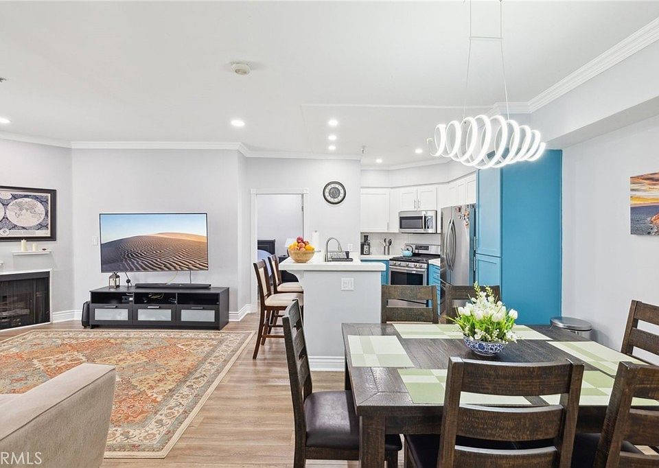 plan seamlessly connects the spacious living room, kitchen, and dining area, featuring elegant hardwood floors and a cozy fireplace, creating a warm and inviting