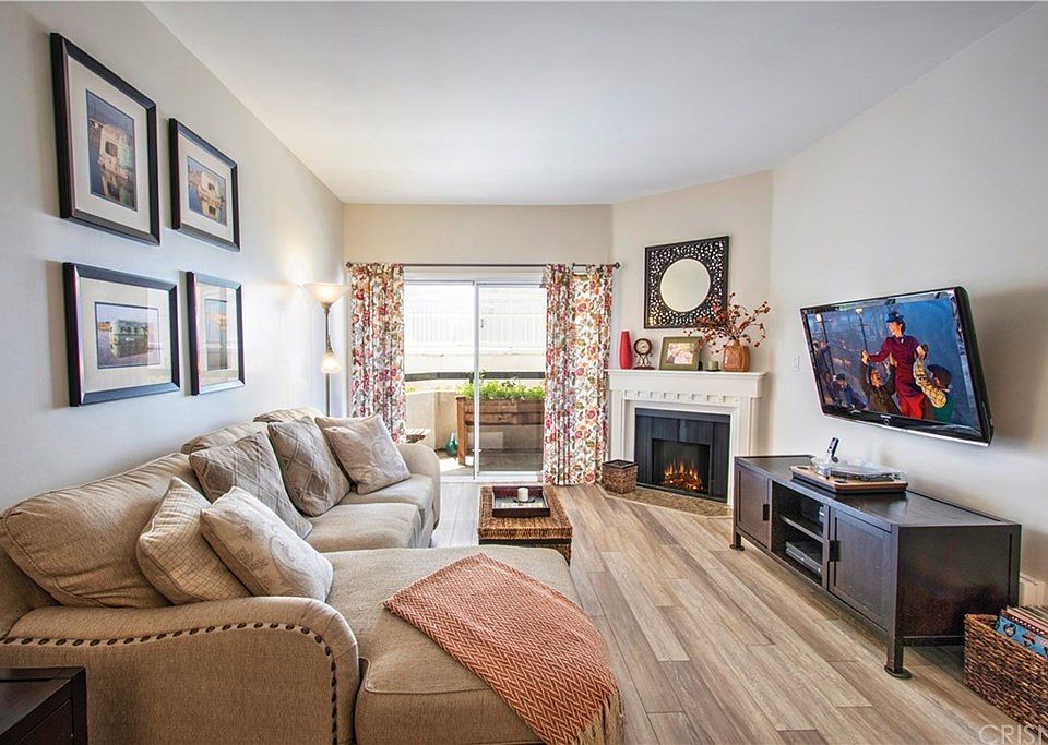 Beautiful updated lower unit condominium located on a quiet residential tree lined street. This home is in absolute move in condition. Great floor plan with dining area and open kitchen, spacious living room includes a fireplace and sliding glass doors to patio, with a storage a closet. The fabulous kitchen is remodeled with Silestone counter tops, custom cabinetry with pull-outs, dual basin stainless steel sink and all new appliances which include stove, microwave, dishwasher and refrigerator (all included). Master bedroom has a walk-in closet and an en suit bathroom. Brand new wood-like flooring throughout. Central Heat and A/C. Secured parking for two cars. Unit is very unique where there are no common walls that are shared - just the one unit above it. Low HOA Fees. This is a must see.