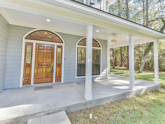 YEARNING FOR A COUNTRY LIFE but still want to be close to it all? This spacious 4/5 bedroom home is nestled on 2+ acres on a quiet cul-de-sac street in TIMBERGREEN and has easy access to the Aggie Hwy. Large kitchen w/ gas cooktop, Corian countertops, a ton of cabinets, places to work and large walk-in pantry. Open to breakfast and family room which both overlook a very private, wooded back yard. Flex room downstairs can be used as office, playroom, or a bedroom. Plumbing is already in place for future ensuite bath. Primary bedroom offers a fireplace and private balcony. The ensuite bath has separate vanities, tub and shower. Generous secondary bedrooms each have walk in closets and are each connected to a bathroom. Game room is HUGE and has endless possibilities. 3 car garage is oversized and has an additional half bath! You will find storage options everywhere in this custom home and we cant forget to mention the porch that wraps 3 sides to enjoy the nature around you!
