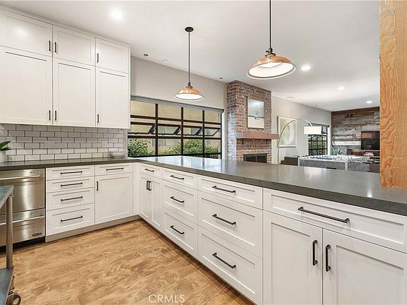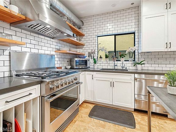 Exceptionally bright ultra-hip unit in a small South of the Boulevard building. This striking Northwest corner townhome overflows with an urban “soft loft” vibe. An abundance of natural light floods the unit through banks of custom Milgard steel frame hinged windows while distressed brick, raw wood accents, exposed ducting, and designer lighting complete the polished loft aesthetic. Enhanced by a modern design, detailed finishing, gleaming wood floors, and high ceilings, this 3 bedroom, 3.5 bath unit with bonus in home office and private rooftop deck is over 2300 square feet of style! An ideal entertainer’s flow is created on the ground level through an open plan layout with brick fireplace, large living area, dining alcove, cozy balcony, and an oversized peninsula styled chef’s kitchen with quartz counter tops, matte white cabinetry, open display shelving, a Fisher Paykel stainless appliance package, counter to ceiling subway tile backsplash, and breakfast bar. Two generously sized secondary bedrooms offer custom built-ins and share a full bath while the impressive primary suite has a professionally organized walk-in closet, private balcony, and a luxurious bath with floor to ceiling subway tiled walls & furniture grade cabinetry. Currently utilized as an at home office, the upper-level bonus room with private bath offers the flexibility to also be a guest suite, secondary lounge, gym, or den and leads to an incredible private rooftop patio with beautiful vista views. Additional amenities include a second-floor laundry room, a whimsical powder room with shiplap accents and a chalkboard wall, a two-car direct access private garage with ample storage, 3 secured guest parking spots, all while offering easy access to the Westside and an amazing location close such trendy spots as Tortoni Caffé, Marmalade, Borekas, and L.A. Times restaurant of the year…Anajak Thai.