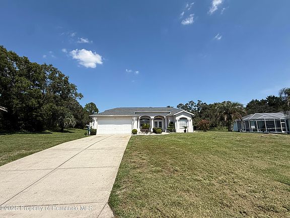 Custom built 3 bedroom 2 and a half bath 2 car garage pool home on 1/2 acre. No HOA, no popcorn ceilings, no carpet! This sought after split plan boasts a beautiful front porch with double door entry with views straight out to the pool from the formal living room with tray ceilings open to the dining room and eat in kitchen offering granite countertops, all black appliances and upgraded led lighting. Just off the kitchen is a large family room complete with fireplace. The master suite also has a tray ceiling, walk in closets, wood laminate flooring and tile in the adjoining bonusroom (perfect for a nursery, home office or gym). The master bathroom is equipped with double sinks, separate shower and jetted jacuzzi garden tub. On the other side of the home is two other bedrooms with plant shelves, ceiling fans and a full bathroom with plant shelves, the laundry room has a washer, dryer and wet sink as well as extra cabinet storage. There is a spacious two car garage with service door to side yard. Inground solar heated 28x14 gunite pool with easy entry, brick flagstone pavers, Screened lanai with covered siiting area, outdoor shower and half bath in pool area. 16x10 wood utility Shed , assorted fruit trees on a private .52 acre lot in close proximity to the suncoast pkwy for easy commute. Roof 2023, HVAC2014, the Well services the whole house and irrigation system, city water also available, septic, Stabilazation completed 2011 docs available- Fully insurable.