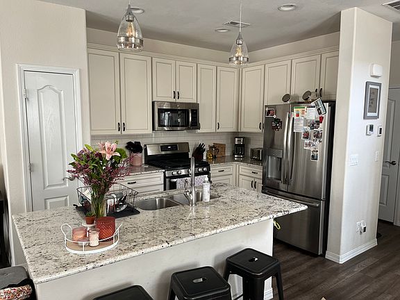 2 en-suite upstairs bedrooms with walk in closets. 3 beds (2 in one room). Large kitchen with upgraded appliances and plenty of space for prepping and serving food. I've loved hosting in this house! 2 full bathrooms upstairs and a half bath downstairs. Side yard and front patio that are fenced.