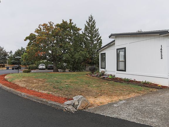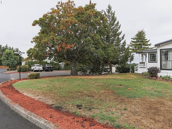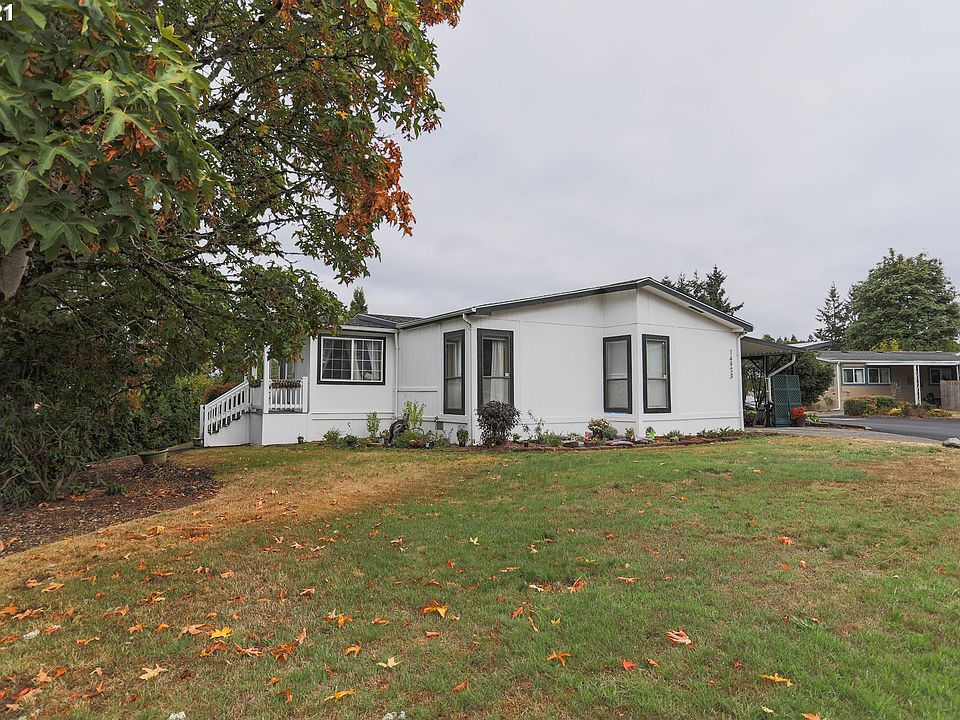 Welcome home to this amazing farm house style double wide manufactured home located on a massive corner lot. This 1988, 3 bedroom, 2 bath, 1,500sqft home has a lot to offer. Large living area with vaulted ceilings, dining room, spacious kitchen, office with custom built-ins, large master/w soaking tub, covered front porch with sun room, storage shed with power, hot-tub pad, in ground sprinkler system, drive-through driveway, extended carport, fresh new paint, and more. Space rent is $671/month