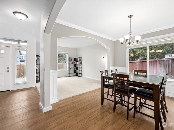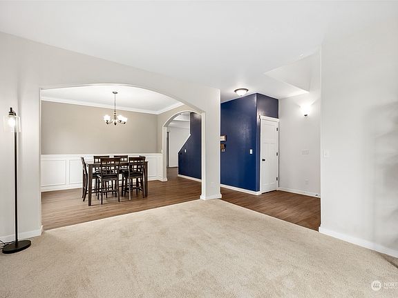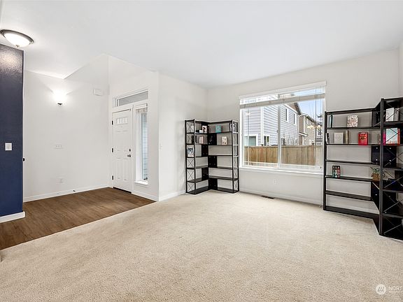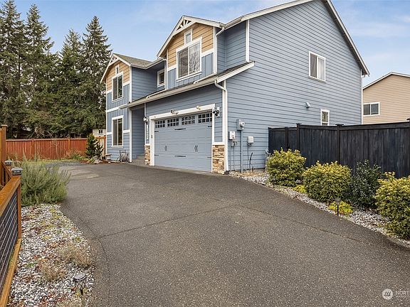 Experience the allure of this exceptional home, w/ captivating Mt. Rainier views from your front door. The main level features an elegant formal living & dining room, alongside a well-appointed kitchen w/ granite countertops, a glass tile backsplash, walk-in pantry, & kitchen appliances that stay. Enjoy the cozy living room w/ a gas fireplace, ceiling fan, & stylish LVP flooring. Convenience is key w/ main-level laundry including a W&D, complemented by a heat pump for cooling comfort. Upstairs, discover 3 bedrooms & a spacious primary bedroom w/ 2 walk-in closets & a lavish 5-piece bathroom. Step into the backyard, complete w/ garden beds & sheds that convey w/ the home for additional storage & a community clubhouse enhances the residence.