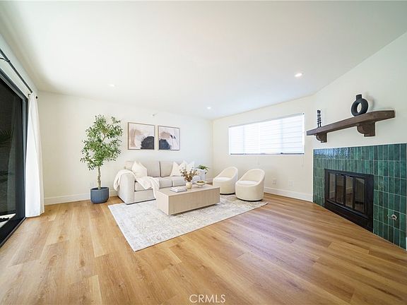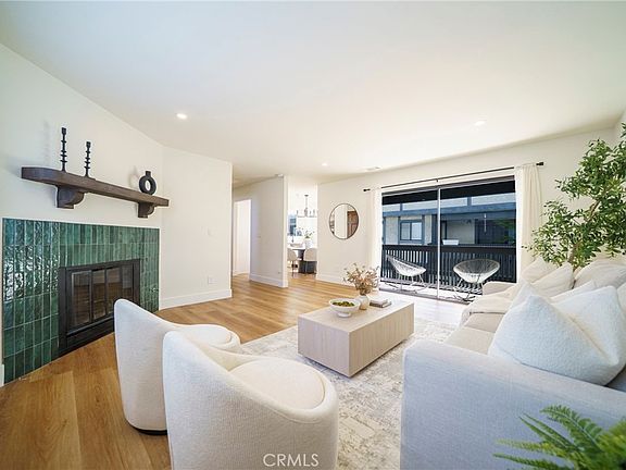 The bright and inviting living room features a cozy fireplace and sliding doors that open to a private balcony perfect for relaxing or enjoying your morning coffee. The remodeled kitchen showcases new white shaker cabinets, quartz countertops, and stainless steel appliances, seamlessly connected to a spacious dining area ideal for entertaining.