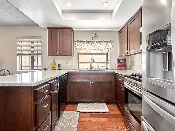 This is a rare opportunity to own a spacious 2 bedroom, 2.5 bathroom condo in a cozy community with a prime location. Upon entering, the living room greets you with hardwood floors, a brick gas-burning fireplace, modern wet bar, and recessed lighting. The kitchen boasts plenty of cabinet and counter space, a bay window, and a spacious pantry. Just around the corner is a well-situated half bathroom, and large sliding doors off the living room provide natural light and access to the enclosed patio for outdoor relaxation. Upstairs, the dual primary bedrooms afford privacy and comfort, each with its own ensuite full bathroom and double closet. The laundry room is conveniently situated upstairs between the bedrooms. Downstairs is an attached oversized 2-car garage with additional storage space. This 20-unit community has secured gated entry along with a community pool and spa. Enjoy convenient living located just steps from a park, freeway access, and major retail shopping centers.