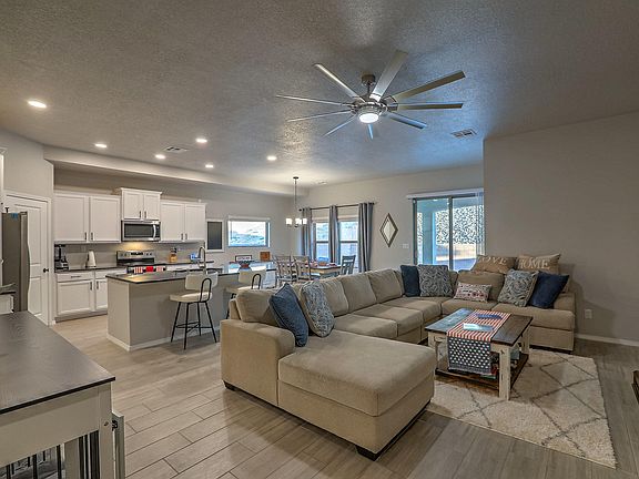 One year young, this 2,025 sq ft single-level home blends modern comfort with functional design. Featuring 3 bedrooms & 2.5 baths, the open-concept floorplan offers a spacious eat-in kitchen w/ island, breakfast bar, pantry, abundant cabinetry, granite countertops & stainless appliances. The owner's suite includes a large walk-in closet, dual sinks, soaking tub & separate shower. The backyard is built for entertaining w/ a fire pit, patio extension & rock landscaping. Additional upgrades include plank tile flooring, ceiling fans, extended driveway, custom garage storage, full gutters, side yard sidewalk, retaining wall and hillside erosion protection--all in a desirable Los Lunas location!