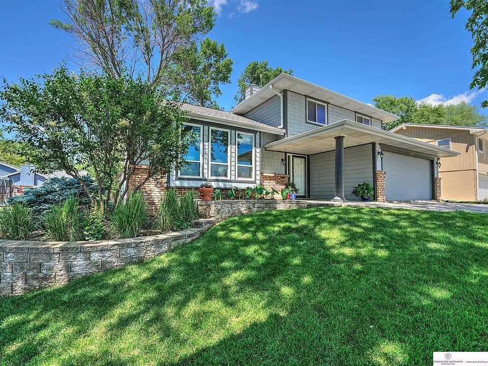 Home under contract - open house cancelled for 6/16. Welcome home to this charming Tri-level in popular Stony Brook, loved by its current owner for 35 yrs. South facing w/large windows and tons of natural sunlight (your plants will love it!). Kitchen boasts vaulted ceilings w/canned lights, painted cabinets, wood floor, large eating area. Living room has soaring ceiling w/built-in bookcase and opens into the formal dining room. Guest 1/2 bath on main level. Cozy up in the inviting family room w/built-ins on either side of the wood burning fireplace. Primary bedroom features wood floor, double closets and updated 3/4 bath. Two additional large bedrooms and updated full bath. Basement includes a finished rec room, laundry room w/sink, and ample storage. Enjoy morning coffee or host a BBQ on the huge paver stone patio. Lovely garden area with retaining wall. Mature trees provide the perfect amount of shade. Newer Hardie siding, windows, AC, roof. Freshly painted kitchen. Walk to nearby Millard schools and park. AMA