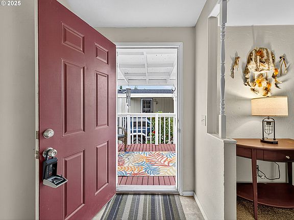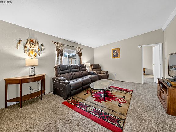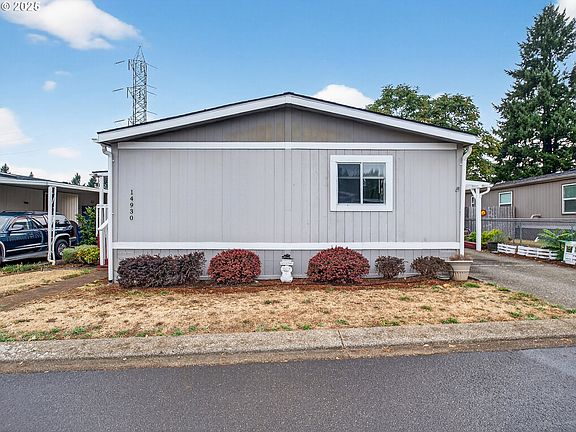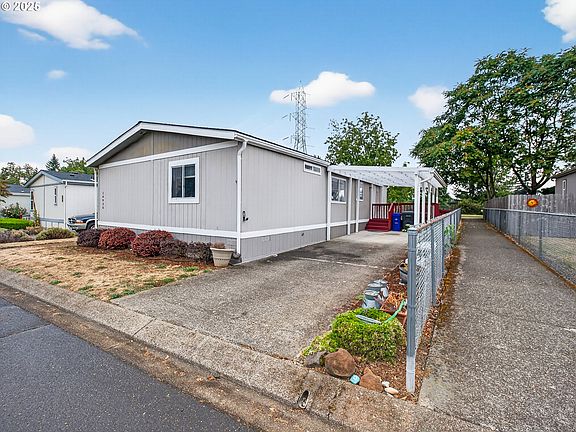 Welcome to this spacious 3-bedroom, 2-bath double-wide manufactured home located in a highly sought-after Oregon City neighbourhood. This home offers a roomy floor plan with an open living area, a bright kitchen featuring an eat bar, and plenty of space for entertaining. 5 year old roof! Carpet and laminate floors also new in 2020 along with the large rebuilt shed.Enjoy outdoor living year-round with both a covered front porch and a covered back deck, perfect for relaxing or gathering with friends. It includes a covered carport, storage shed, and sits on a large, fenced lot that backs up to usable green space and a playground!With its inviting layout, abundant storage, and prime location, this home combines comfort and convenience in one package. Don’t miss this opportunity to make it yours!