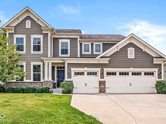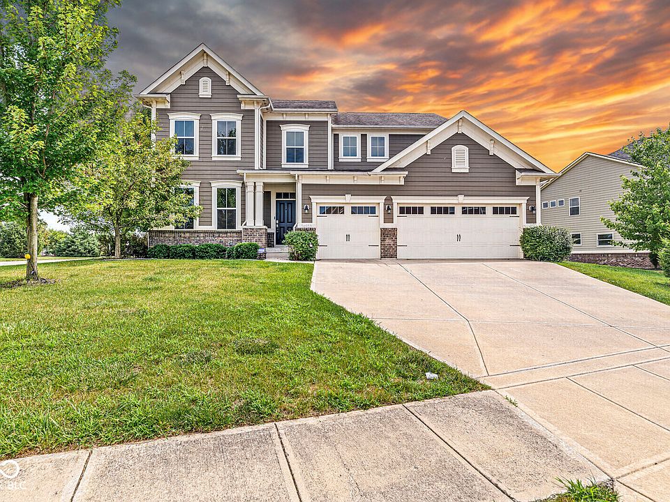 Village at Bridgewater! Discover luxury living in this stunning corner-lot residence featuring 4 bedrooms and 2.5 baths. Freshly painted throughout, this home showcases an inviting open-concept design centered around a custom 12-foot kitchen island, updated GE appliances including double ovens, and upgraded cabinetry with convenient rollout shelving. A charming breakfast nook and formal dining area make this space ideal for both everyday living and entertaining. The family room, pre-wired for 5.1 surround sound, offers the perfect spot to unwind beside the cozy fireplace. Those working from home will appreciate the private office just off the entryway, plus an additional workstation near the kitchen featuring custom shelving and Office-Wall surge protection. An elegant 8-foot Swarovski crystal chandelier highlights the staircase, leading to a versatile loft/media room complete with a projector, snack bar, and fan-cooled media cabinet by California Closets-perfect for movie nights. The primary suite is a true retreat, boasting a tray ceiling, custom lighting, and a California Closets walk-in closet with direct access to the laundry room. The luxurious primary bath offers dual sinks and a spacious double shower. Downstairs, the 1,358 sq. ft. unfinished basement provides endless potential for future expansion or personalized design. Situated on a premium corner lot, the property offers abundant outdoor space for entertaining or relaxation. Enjoy the exceptional Bridgewater amenities-including golf, pools, trails, and a clubhouse-along with convenient proximity to top-rated Carmel schools and local shopping. This home is filled with custom upgrades and thoughtful details that must be seen to be fully appreciated!