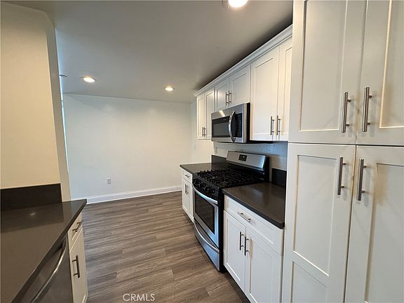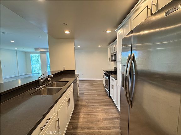 Step inside to find an inviting open floor plan filled with natural light, chic faux wood flooring, and a spacious living room with a cozy fireplace. The living area opens directly to a front-facing patio.. A large separate dining room flows effortlessly into the living room, creating an ideal layout for both gatherings and everyday living. The contemporary chef's kitchen is designed for convenience and style, featuring stainless steel appliances, quartz countertops, white cabinetry, a gas range/oven, built-in microwave, dishwasher, side-by-side refrigerator, breakfast bar, and recessed lighting.