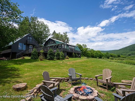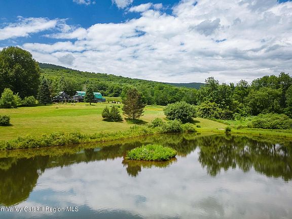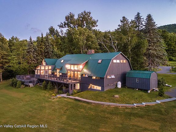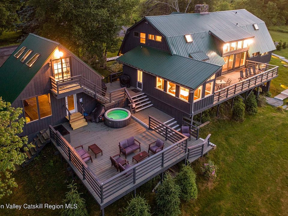 Meeker Hollow Barn and Estate - a unique blend of historic charm and modern luxury in this fully renovated 3-level barn in the Catskills. Once a celebrated wellness center, this 4800 sq ft gem sits on 20+ acres of pristine land with panoramic mountain views from the deck spanning the entire back of the house. The grounds are surrounded on 2 sides by DEP Forever Wild land, with a 1.5 acre crystal clear, spring-fed swimming pond, hot tub, stream and fire pit area. The main house has 8 bedrooms, each with its own private bath, with a separate guest apartment on the lower level, a massage room and a grand open concept living area. There is a separate structure with a gym/yoga studio on lower floor and separate studio guest suite above. Perfect for large gatherings, operating as a high-end Airbnb or retreat center. Conveniently located 2 miles from Plattekill Ski Resort and close to multiple Roxbury wedding venues. Perfect for investors or those seeking country luxury. Near all area attractions and the villages of Margaretville and Roxbury. Your Catskill Dream Awaits.