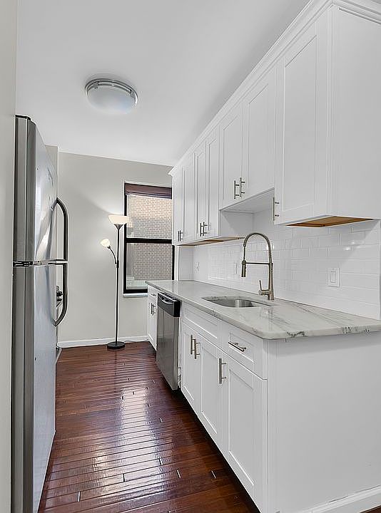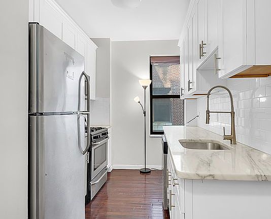 The apartment boasts a spacious layout with a large living room and bedroom, great natural light, and excellent closet space. The kitchen is outfitted with white cabinetry, stainless steel appliances, and sleek marble countertops. The windowed bathroom is finished in marble, adding a touch of elegance to the space. Rooms are well-proportioned and bright, offering a comfortable and functional living environment. An in-unit washer and dryer is permitted, and there is also a common laundry room available in the building.