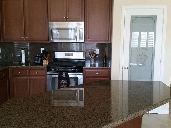 Home is a fantastic floor plan! Both smaller bedrooms are on one side of the house and master on the other. It is a great room concept with a beautiful kitchen, stainless appliances, gorgeous granite and tasteful upgraded cabinets with nickel knobs. The floors are a wonderful 20X20 tile with carpet in the bedrooms. The back yard has stamped concrete for dinner on the patio or coffee in the mornings! To top it off, the garage door is a carriage style door and the garage is an extra 4ft for trucks