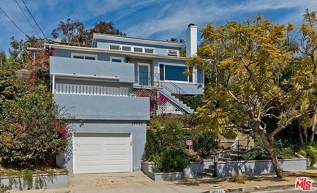 Charming Ocean View Bungalow. Light-filled with open beams, high ceilings, skylights, fireplace, and a large picture window framing gorgeous ocean views. Surrounded by mature landscaping and blossoming flowers sits a warm split-level home with 3 bedrooms, 2 full baths, wood floors, an updated kitchen, and outdoor barbeque area. Enjoy dining al fresco and watching the sunset on 2 sunny front patios with ocean views. There is a large flat backyard/play area up a few steps, behind the house. Move-in condition, with the potential to expand. Abundant storage room off of lower patio. Walking distance to Palisades Village, shops, and restaurants. This is a fabulous opportunity to purchase a starter home in a luxury neighborhood.