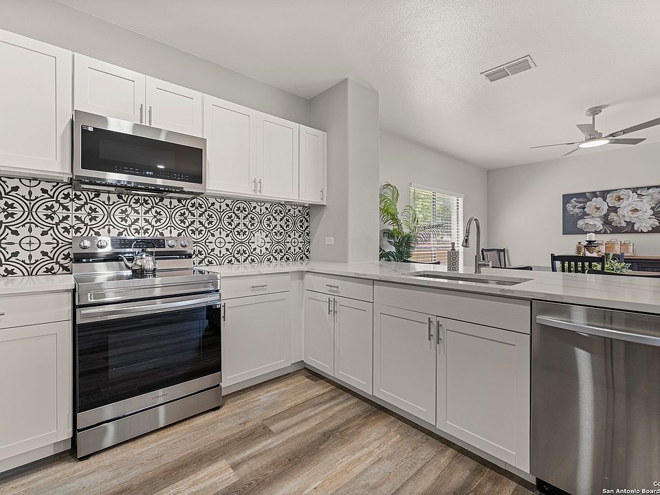 NEW REDUCED PRICE!! Meticulously updated inside and out, this home is ready for immediate move in! Four luxurious bedrooms and two and a half baths with multiple living areas and a separate dining room, all resting on a large cul-de-sac lot, and nearly everything you can touch is new. Exterior light fixtures, privacy fence, deck, driveway, some landscaping and the roof recently replaced. Foundation leveled with a thirty year warranty! Inside you'll discover fresh paint, just laid vinyl floors throughout, new kitchen sink and appliances including a side by side refrigerator, and all new kitchen cabinets with quartz counter tops as well. Every light fixture, all fans, window treatments, toilets, faucets, and bathroom shower tile recently replaced! Plus a new garage door opener and epoxy floor! Located in a gated neighborhood inside 1604 with an elementary school across the street and convenient to almost anywhere you want to go, this home is a truly exceptional find!