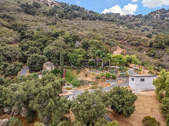 Peaceful country living with easy city access, minutes from Escondido and Valley View Casino. This refreshed 4-bed, 2-bath ranch home sits on 9.24 serene acres, offering spacious living and stunning views. Recent updates include fresh paint, new carpet, mini-split A/C, electric water heater, stainless steel range hood, and pool pump. The flexible layout features a great room with high ceilings, a brick fireplace, and space for formal living or dining. 13x11 Bonus room (not in tax assessor square footage) with its own entrance is perfect for an office, craft room, or play area. The galley kitchen includes ample storage, deep drawers, a pot rack, and a walk-in pantry/laundry. Large (14x14) primary bedroom has an ensuite, a wall of closets, and natural light. The huge (20x19) fourth bedroom, with built-ins and exterior access, is ideal for multigenerational living. Paid-off solar system. Outside, enjoy a tranquil pond with a rock waterfall, shady garden, and valley views. A built-in pool, framed by oaks and stone formations, is perfect for laps. The property also features fruit trees—lime, lemon, pear, apple, peach, avocado—and blackberry vines. The front courtyard includes a covered porch and new artificial turf, perfect for relaxing. Huge (30x15) 2-story workshop, storage sheds, plus an outbuilding with electricity and water. Covered parking accommodates three vehicles, including an RV or boat. Flat usable land on north end of property offers future development potential, and a new septic tank for RV hookups is installed (never filled/used).
