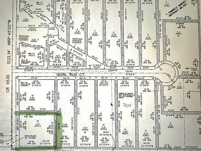 2 acre lot in a new Quail Creek Subdivision with no HOA. Bring your own builder and build your dream home in this beautiful country setting. Well and Septic will be needed. No timeline to build. Barndominiums are allowed with 30% masonry at front elevation. 2000 sqft minimum. No mobile homes or manufactured homes. This lot will have entrance off the county road.
