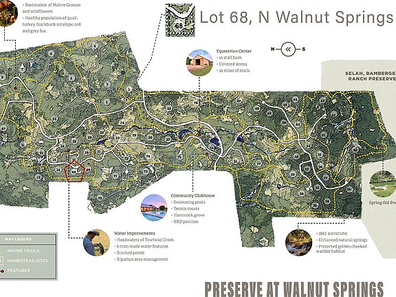 Nestled within the exclusive 2,030-acre luxury ranch, discover Homestead 68 perched atop a hillside, providing breathtaking views of the rolling hills and lush canopy below. Majestic heritage oaks frame an enchanting drive up to a private and expansive level build envelope that seamlessly embraces both the sweeping vistas and mature hardwoods. The acreage includes the benefit of a pre-drilled well and underground utilities. The Preserve at Walnut Springs, crafted by the visionary team behind the exclusive Indian Springs Ranch in Jackson Hole, offers 1,500 acres of open space with only 66 homeowners, 22 miles of trails, 6 ponds, 2 natural springs, and a refreshing spring-fed swimming hole. Ownership includes an ag exemption and grants access to a community clubhouse, swimming pools, tennis courts, sports court, putting green, and an equestrian center—all meticulously overseen by a dedicated Ranch Manager. Located just an hour from Austin and San Antonio, The Preserve is easily accessible to both cities and popular hill country destinations.