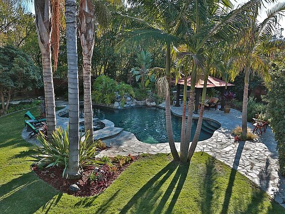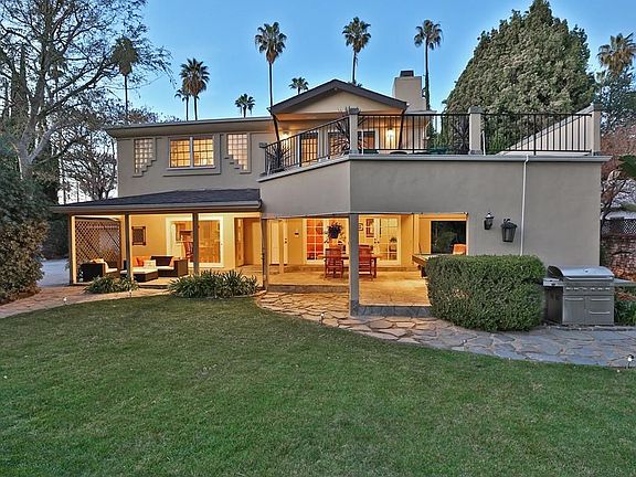 Private and gated traditional 2 story home with enthralling resort style backyard. Enjoy a family dinner in the formal dining room with double high ceilings or dine casually in the eat-in kitchen. Take the elevator from the first to second floor and unwind in the spacious master bedroom with vaulted ceilings, fireplace, spacious master bath, walk-in closet, and double French doors leading out to the expansive private patio overlooking the backyard. Among mature trees and under near complete privacy enjoy a day in the swimming in the salt water pebble tech freeform pool with waterfall and hot tub. A wood paneled office, formal living room, and den make this a home with spaces for everyone. Once a walnut orchard, this neighborhood was developed for those that worked in the government center, all the properties on this 3 block street are among the largest in the San Fernando Valley. Motor court and 1 Bed, 1 bath guest house.