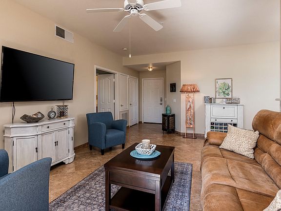 Popular GRANDE model. All tile flooring. New refrigerator & dishwasher. New paint. Wood blinds T/O. New lighting. Updated hot water heater. New rollers in patio door. Security door. Furnace/AC serviced in last 12 monthsl. GOLF CART parking space included (#G40). This unit gets east and south sunlight. It's bright and cheery and shows like a model home. All appliances included. LaSolana Condos boast their own heated beach-entry pool, spa, club house, theatre, lending library, hair salon and resource room (w/computers). The wonderful amentities of Sun City Grand are also part of ownership. This 252 unit complex is within walking distance of restaurants, grocers, medical facilities and more. One covered parking space assign to this unit (#1). Pet friendly and rentals are allowed