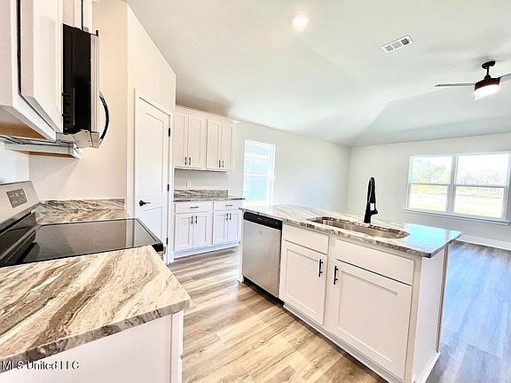 This charming design combines the timeless appeal of a cottage-style home with modern functionality, creating a space that feels warm and welcoming. Step inside and be greeted by a cozy and open living area that serves as the heart of the home. The open-concept design seamlessly connects the living room, dining area, and kitchen, creating a versatile and inviting atmosphere for gatherings with family and friends. The kitchen is thoughtfully designed, featuring modern stainless-steel appliances, ample cabinet space, spacious island, white cabinets with Fantasy Brown stone countertops, and large walk-in pantry, making meal preparation a breeze. The master suite offers a private retreat, complete with a well-appointed en-suite bathroom with Fantasy Brown stone countertops and white cabinets with framed mirrors, a separate tub and shower, and a spacious walk-in closet, providing comfort and convenience. Two additional bedrooms offer versatility, whether for accommodating family members, and guests, or creating a home office or hobby space. Floating plank flooring is found in all areas except the bedrooms. The modern details stand out with the matte black lighting and plumbing fixtures, door handles and hinges, and bathroom shower and mirror frames. This home also includes a backyard patio, extending your living space outdoors and providing a cozy spot for relaxation or enjoying the fresh air. With quality craftsmanship and attention to detail, this home exudes the charm and character of a cottage-style residence. Embrace the cozy and functional design of this home and make it your own, creating a space that perfectly suits your lifestyle and brings joy to everyday living.