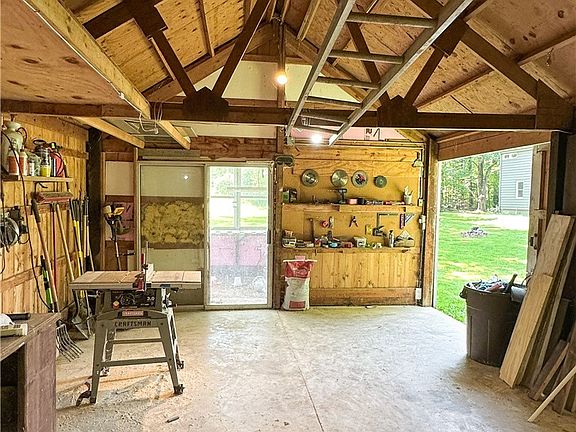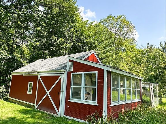Nestled on 5 acres on a dead-end street in the West Geauga School District, this charming home offers both privacy and space. The property is mostly wooded with a generous green area in the backyard. The main floor features the kitchen, original hardwood floors throughout the living and dining area, one bedroom, and a full bath. Upstairs are two additional bedrooms connected by a Jack and Jill half bath. The larger bedroom includes built-ins and a cozy nook, adding to the home’s character. Outside, an outbuilding with a concrete floor and electric is ideal for storage, hobbies, or a workshop. The attached 2-car garage includes an unfinished bonus room above, it has windows and good height ceilings. Some electrical work was started in the space, it's ready for you to finish and make your own!