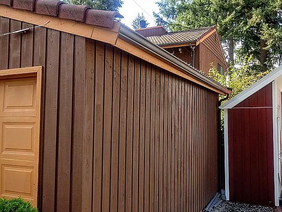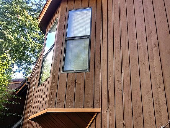 Three levels the main entrance is on the second floor. The top floor is the penthouse ( master bedroom ) it runs the full width of the house. There is a deck and large windows facing west that gives it the feeling that you are living in a tree house, the two immense douglas firs in the yard might have something to do with it. There is a large bath with a tub. A truly walk in closet and a fireplace to make it cozy. The main floor has a great little kitchen with tile countertops and floors too. Just outside of the kitchen is a nice bay window that makes a great breakfast nook. There is a open floor plan and two fireplaces on the west side there is large windows and a sliding glass door opening on to large private deck lots of sun here! The basement has three bedrooms one of which has its own entrance. Another has built-in storage across one wall. The laundry room is here too it has lots of room for a extra large washer and dryer with a storage cabinet to keep supplies and a great counter top to fold your clothes on, there is all kinds of hanging space also. The full bath has lots of storage for towels and everything else. There is a small deck on this level also which stays dry, it is under the large deck on the second floor it has a nice view of the back yard and is perfect for a hot tub.