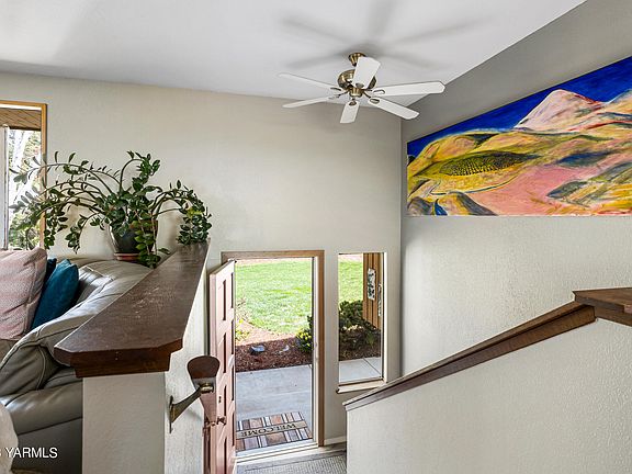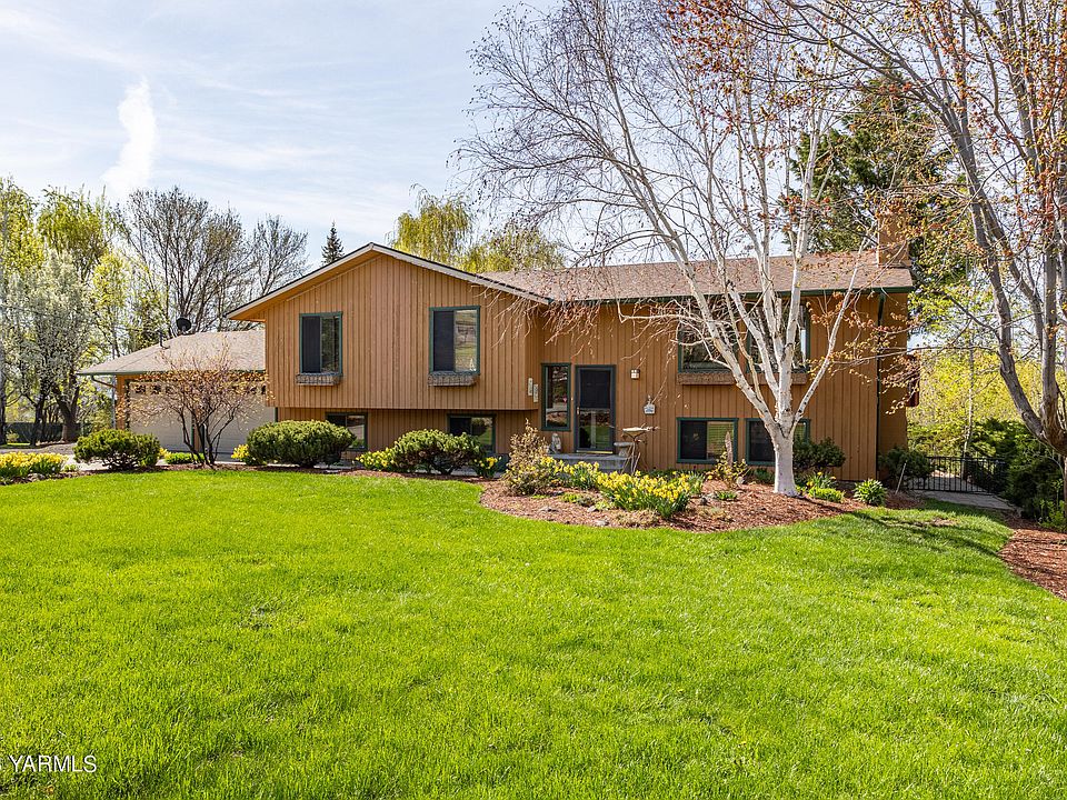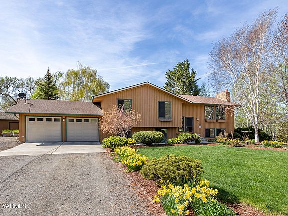 Scenic Sunsets await you, from the northern slopes of West Valley... Custom built, this home is perfectly positioned for privacy and to take advantage of panoramic views, including of Mt Adams. Easy maintenance home and yard! The split entry design offers a great room with fireplace on the main level, access to the view deck, the Primary and two guest bedrooms. Downstairs you'll find a large family room with patio access, the utility room and a large 4th bedroom which is plumbed for a propane fireplace. The setting is a lush, park-like 2 acres with multiple areas of lawn, hardscape and RV parking (family reunions are in your future). The dry-creek bed, dining pergola, and croquet lawn are just the beginning. The 1800 sq ft shop has 10' doors, and a woodstove. Yakima-Tieton irrigation and a timed, underground sprinkler system make maintenance affordable and easy. The home has been lovingly cared for and upgraded with new flooring, kitchen appliances (oven has built in air-fryer), and fresh paint. Updated roof and heat pump.Shown by appointment only.