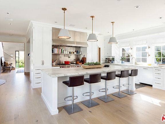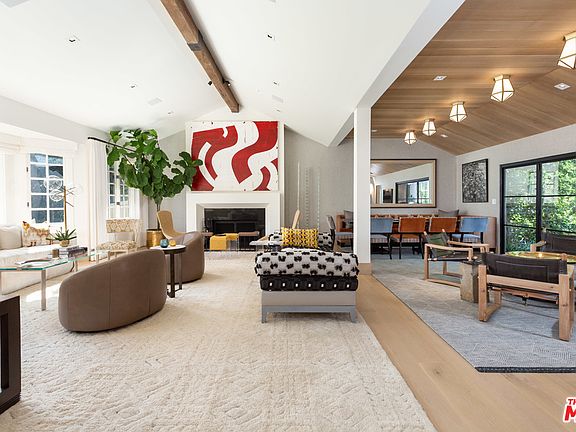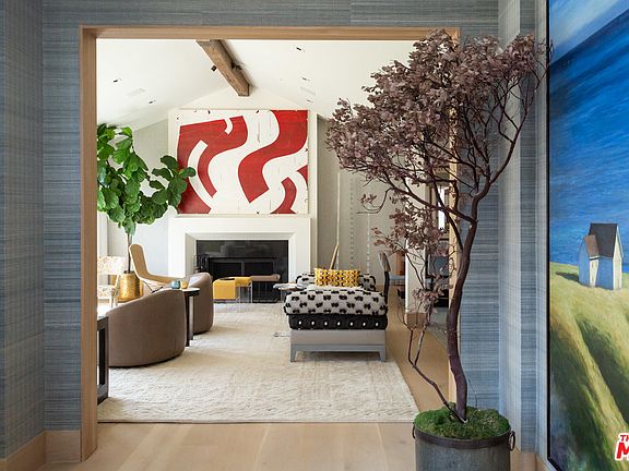 A grand foyer welcomes you into this sensational home, which was featured on the cover of Luxe Magazine. This home's style and elegance are on display, along with the finest in contemporary comfort. French oak floors and custom wall coverings feature throughout, making evident no expense was spared in renovations. Large windows, cathedral ceilings, and exposed beams highlight the vast open-plan layout. The home chef will appreciate the luxe kitchen fitted with top-of-the-line appliances and a large center island. Take your pick of the master suite upstairs offering a private pergola-covered deck, or the downstairs master opening out to the lushly-landscaped oasis with a pool and jacuzzi. There's also a detached pool house and bar, making for the ideal space to entertain. Bonus features include a custom bar with brass shelving and an iron and oak handrail, an office and gym, a detached three-car garage with a lift, a sizable, well-designed wine cellar, and more. Just steps to the beach and near plenty of dining and shopping options, this marvelous Pacific Palisades manor will leave you in awe. Huntington Palisades living at its finest!