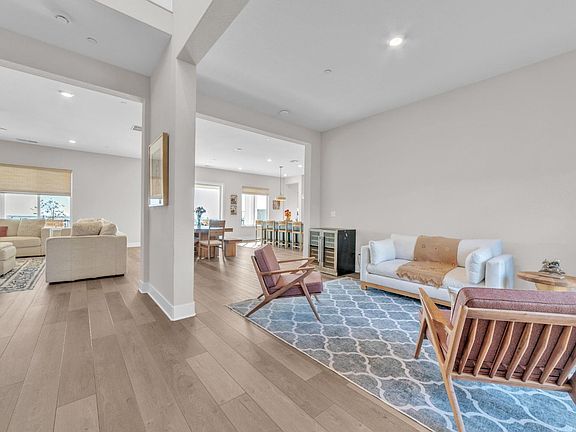 Northwest facing and perfectly positioned in the highly desired Russell Ranch community within Silver Crest by The New Home Company, this modern two story home blends luxury, comfort, and functionality. It features 5 bedrooms and 4.5 baths, including a spacious downstairs bedroom with a full bath ideal for guests or multigenerational living. The open concept layout offers a seamless flow between the kitchen, dining, and family areas, complemented by a home management center, an upstairs loft, and an extended California Room for indoor outdoor entertaining. With over $200K in upgrades, this home includes wood floors throughout the downstairs, GE Caf appliances, white cabinetry, quartz countertops, open rail stairs, premium flooring, framed mirrors, upgraded shower glass, a cozy fireplace, a 3 car garage, and owned solar. The primary suite features a private covered deck with stunning sunset views. Outside, enjoy a beautifully landscaped backyard with turf, garden beds, a water fountain, and a pergola, designed for low maintenance living. Access to The Russell House amenities including pools, hot tubs, fire pits, and more completes this exceptional home.
