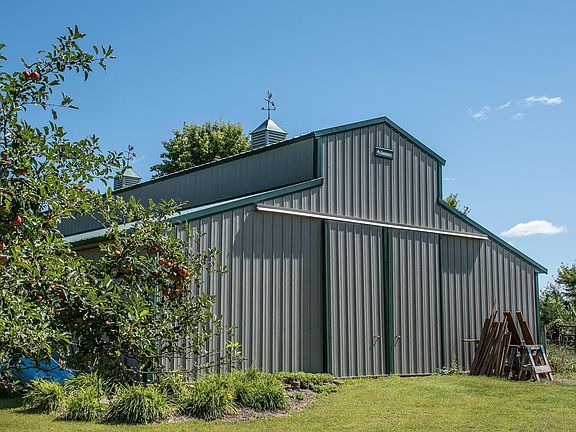 Very secluded 80 acre paradise with modern, rustic "barn look" home, large pole barn, apple trees and mixture of gently rolling pasture and woods.