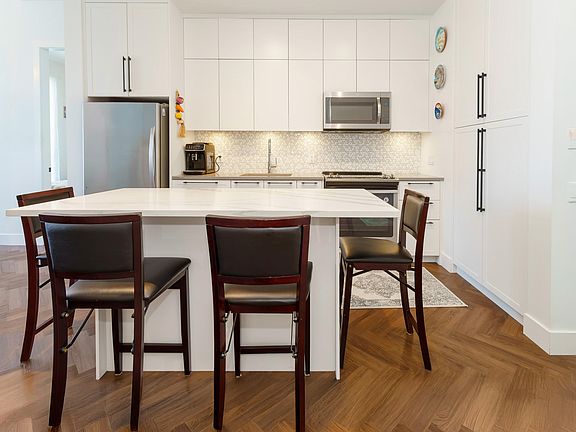 Modern kitchenQuartz countertopsSleek cabinetryStainless steel appliancesCustom built islandCustom back splashPrivate patio