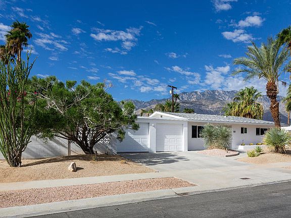 Welcome to El Rancho Vista Estates, one of Palm Springs' most cherished mid-century neighborhoods, where this Atomic Ranch seamlessly combines nostalgia with modern desert living.Entering this home you'll be greeted by a spacious living room open to a bright dining area lined with windows. The dining space seamlessly connects to an open kitchen with a family room beyond, creating an inviting, continuous layout. Here, sliding doors and windows offer stunning mountain views and easy backyard access.The thoughtful redesign of the kitchen features a sizable prep island with seating for up to five people. It has sleek quartz countertops, crisp white cabinets, and a stainless steel appliance package. The former third bedroom has been transformed into a cozy family room, perfect for casual gatherings, watching TV, or simply soaking in the views.This home sits on a unique, pie-shaped lot, allowing for multiple outdoor seating areas, a beautiful pool and spa, and a spacious yard.Inside are two primary suites. The smaller one to the front of the house includes an updated ensuite bathroom. The larger primary suite has vaulted ceilings with clerestory windows, a contemporary dual-vanity bathroom, and sliding doors that lead to the backyard.A third guest bathroom is easily accessible from the hall, ideal for those staying overnight in the family room. Additional amenities include an indoor laundry closet and a 2-car garage. Perfection.