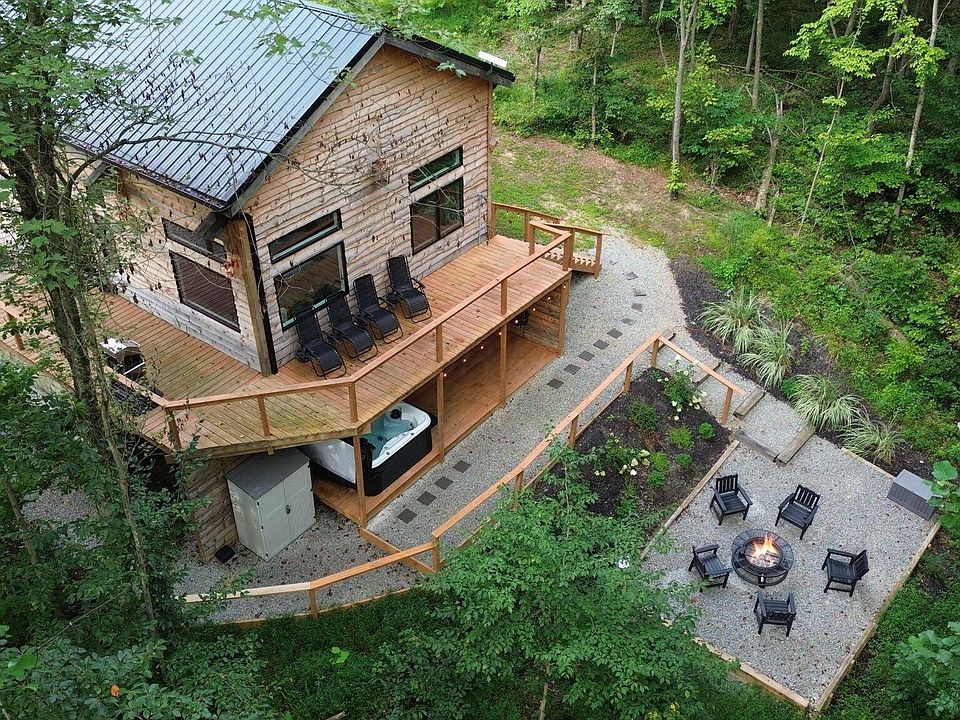 Relax in the hot tub beneath the elevated deck, unwind by the fire pit, or explore nearby trails. Practical amenities include keyless entry, a hidden laundry area, programmable thermostat, metal roof with gutter guards and drive-up parking a few steps from the door.