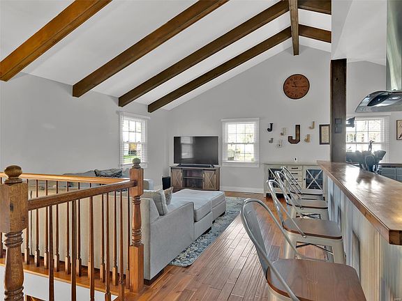 Wonderful home in the heart of Chesterfield & Parkway West HS boundaries is available because sellers are being transferred out of state. This is a relo listing. This spacious 5 bed/3 full bath home offers over 2200 sq ft of nicely updated living space. The main level features a stylish kitchen w/ SS appliances, sleek cabinetry, and engineered wood flooring that flows throughout much of this floor. The layout is unique & very cool, w/open concept, beamed, vaulted ceilings over the great room & dining room, and the kitchen positioned as the hub of the home. The lower level, in addition to the 2 beds, offers a family room, great flex space, a large playroom, & office space. With a huge wrap-around deck, beautiful lot backs to expansive common area that can be enjoyed from the deck and patio. This home provides comfort, style, & a great location in one of Chesterfield's most desirable neighborhoods! See add'l details under each photo!