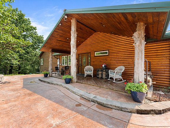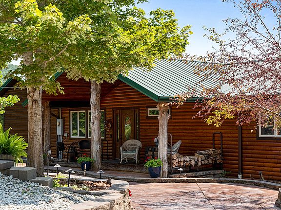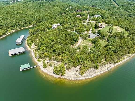 Incredible Lakefront Paradise off Hwy DD winding through the Nat'l Forest to end of paved road on the point w/detached 2-car garage, walk down to a landscaped goregous setting to an exceptional property on 3.04 acres, offering a cozy, immaculate 4BR/5BA home w/woodsy decor enjoying awesome sunsets. The front door entry off covered front porch admire the soaring wood ceilings, massive stone fireplaces w/open concept living on Table Rock Lake. Enjoy engineered hardwood flooring while checking out custom kitchen w/pull-outs, soft close features, energy star appliances, granite tops, island w/prep sink & kitchen bar,huge pantry w/room for extra refrigerator & freezer, a dining area w/expansive windows almost bringing the outdoors to you, w/open concept leads you to the enormous carpeted living room w/huge Stone Wood burning fireplace, windows & sliders to tile plank covered & screened deck to treasure awesome lakeviews. Master Suite offers stone gas fireplace, sitting area, windows to lake, custom closet & bath w/separate sinks, shower & relaxing jetted tub w/unique designs & washer/dryer space. Lower level has large Master suite w/sliders to covered patio area & views of the lake, unique custom designed tile plank shower w/full bath is awesome. Huge family room w/stone gas fireplace & sliders to the covered & screened patio, closet w/washer/dryer, Guest BR w/slider to patio, custom Guest Full BA,, huge Bunk Room w/3 sets of bunk beds & slider to patio, bonus room now BR (no window) & custom Guest half bath. Step out back to lakeside 1 car garage & storage w/a huge flat area in front of it w/fire-pit & walk on down to custom designed private-2 stall dock to be purchase by Buyer addt'l. See the 3500 sq ft log LF outbuilding & LF vacant lot all on separate tracts & included in price along w/majority of furniture in home. Mins to post office, restuarants, medical, Wal-Mart, & 20 mins to Branson & 30 mins to Springfield is this EXCEPTIONAL TABLE ROCK PARADISE & HOME