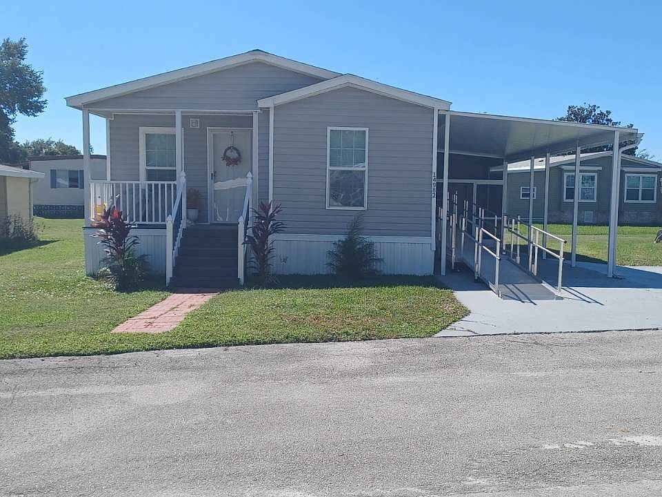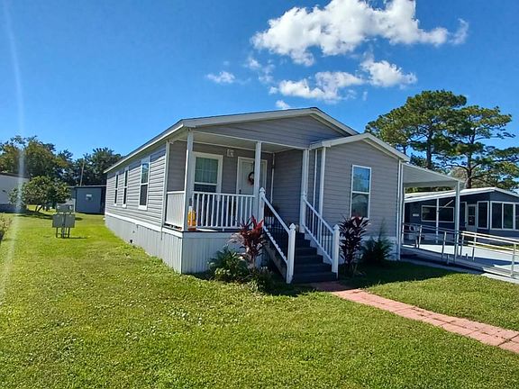 Come settle down and relax in a beautiful, manufactured home with 1,300sq ft living space, located in The Fairways Country Club a 55 plus gated community. This is a new home less than 2 years old. Your front entrance is through an open porch, where you can sit and relax. Walk into a spacious living room that opens into the kitchen. This is your home sweet home with a well-lit modern kitchen with modern outstanding décor cupboards, modern appliances and a beautiful middle kitchen aisle that features kitchen dining. This home has a separate laundry room. Walk into your Master bedroom with a bathroom that includes 2 modern separate vanities, and separate stand-up shower. Lots of closet space. The 2 Guest bedrooms has direct access to a large bathroom The walls are finished drywall, and the home entire floor is beautifully wood laminate, and it also have double Thermopane windows. The community sits on an 18-hole golf course. The community is about 35mins from Disney, and 40mins from Cape Canaveral also less than an hour from major beaches. Come to The Fairways Country Club and enjoy the family oriented atmosphere of the community as well as participate in all the numerous entertainment functions, activities and amenities. All listing information is deemed reliable but not guaranteed and should be independently verified through personal inspection by appropriate professionals. Integrity Mobile Home Sales cannot guarantee or warrant the accuracy of this information, measurements, or condition of any property. Measurements are approximate. Lot rent is subject to change.