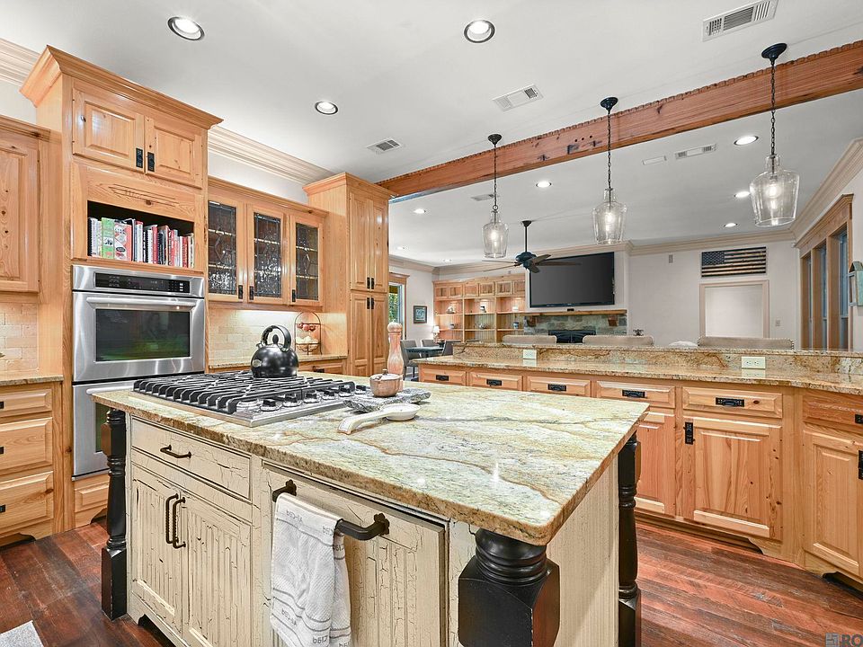 Beautiful, custom built 3 bedroom, 3 bath home with an office that sits on just over one & a quarter acre lot. Open floor plan that is perfect for entertaining. 9 foot ceilings and wood floors throughout living areas. Kitchen features granite countertops, custom built cypress cabinets, walk-in pantry, large island, gas stove, double ovens, stainless steel appliances, and a wine fridge. One of the biggest primary bedrooms you'll see with a en-suite with dual vanities, separate shower, and soaking tub. You can enjoy owning a piece of LSU history with the wood floors in the 2 additional bedrooms being reclaimed wood from the original Alex Box stadium! Flooring was added to the attic and there is additional storage space above the carport. Enjoy outdoor living with an inviting wrap around porch in the front of the house and a screened porch in the back. Feel right at home on the outdoor patio with its fireplace, pergola and a wonderful view of the pond. Along with the home having a whole house generator, there is also a detached 20x30 shop with electricity plus additional enclosed storage areas. Home did NOT flood.