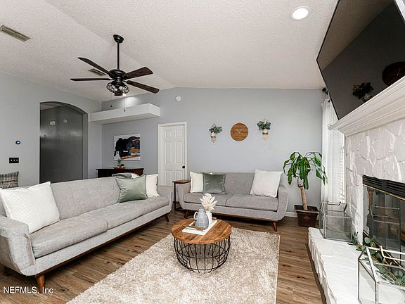 Welcome to this charming single-family home featuring 3 bedrooms and 2 bathrooms, ideally located for easy access to shopping, dining, boating, NAS Jax, and Interstate 295. Step inside to discover an inviting open floor plan where the living and dining areas flow seamlessly and are enhanced by a cozy fireplace. The kitchen boasts a NEW quartz countertop. Enjoy peace of mind with a ten-year-old roof and an HVAC system replaced just three years ago. Outside, indulge in the above-ground pool and privacy-fenced backyard. Recent upgrades include new Quartz kitchen counters, new carpet in the bedrooms, a TV mount in the living room, and updated light fixtures throughout. This smart home is equipped with a Nest Thermostat, Alarm, Door Bell, and Door Lock for modern convenience. Located in a quiet neighborhood, this remarkable property won't last long—schedule your showing today!