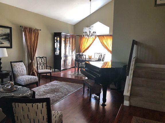 Inside, the main entry opens to spacious living and dining areas with vaulted ceilings, modern recessed lighting, and direct access to a 3-car garage. Flooring is primarily wood and tile, with carpet only on the staircase.